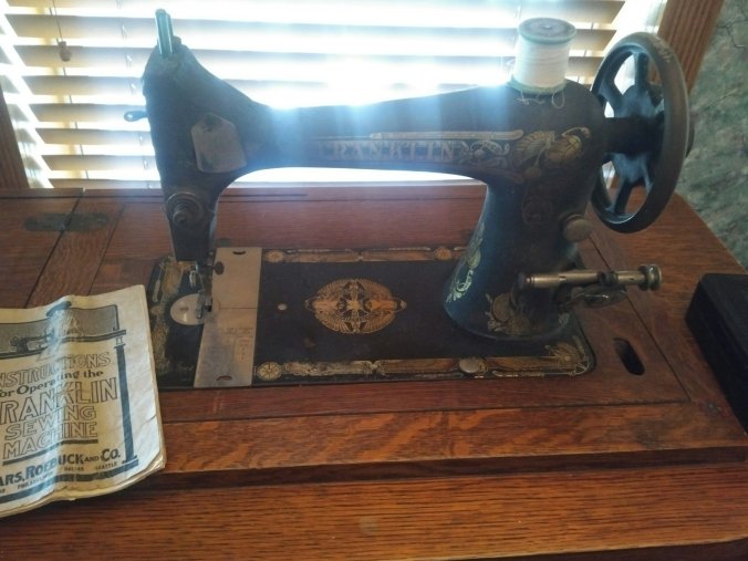 A Franklin treadle sewing machine in the original cabinet with all the attachments AND. . .the instruction manual.