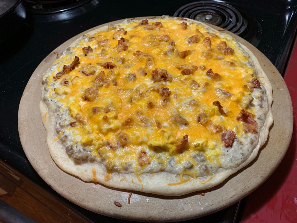 My daughter loves Casey’s breakfast pizza. However, in our neck of the woods, Casey’s doesn’t exist. After having made biscuits and gravy the other morning for breakfast, I had a wonderful good idea. Since she and I are the only ones who eat the biscuits and gravy (Sam just is not a gravy kinda guy), if I make a full pan of gravy, we’ll have leftovers. The old brain is starting to function.