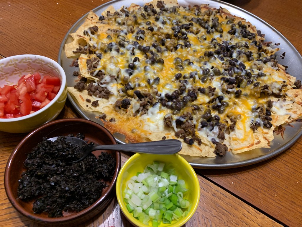 Set oven to 350. Brown hamburger in skillet, adding seasonings to taste. I don’t actually measure, I just sprinkle until it looks good. Spread tortilla chips on a pizza pan or baking pan. Drain any grease from hamburger, and sprinkle meat on top of tortilla chips. Spread black beans on top of meat. Top with the shredded cheeses. Bake for about 12 minutes. Serve with the garnishes listed above, or whatever you like.