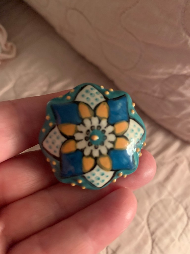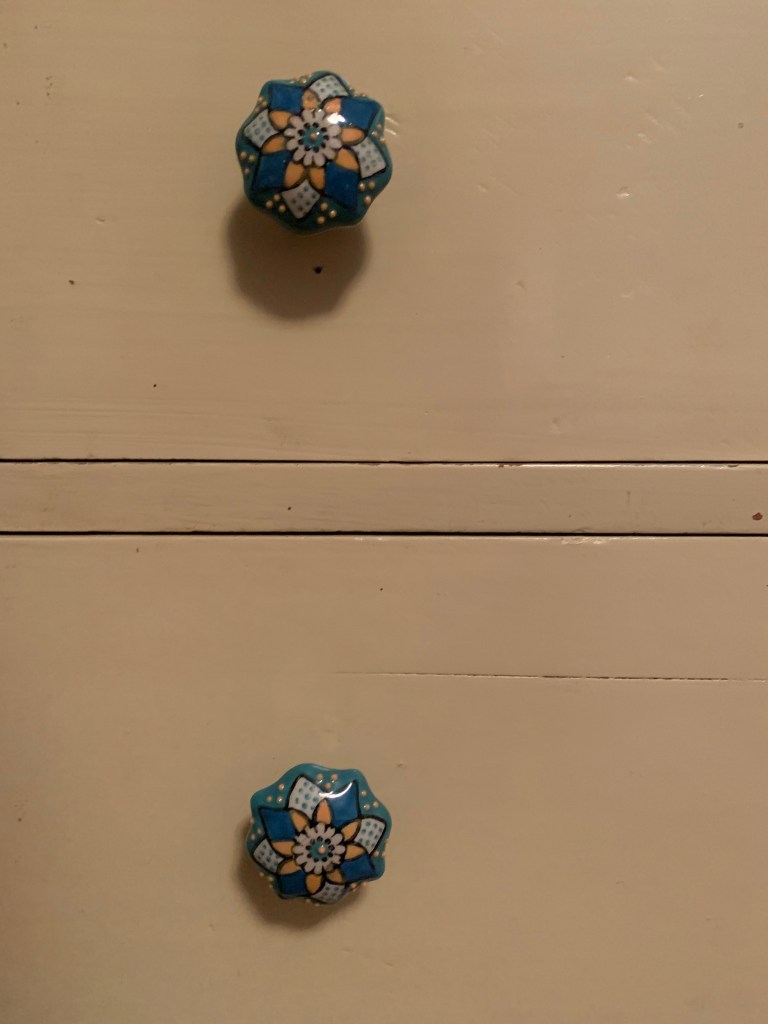 I wanted something fun and whimsical. Something that doesn’t scream “farmhouse” of which my house certainly is NOT, nor will the decor be the milquetoast variety of that “farmhouse chic” which has been popular. I needed drawer pulls that would complement the pale yellow of the dresser, but also jive well with the midnight blue I want to use. The knob above fits the bill perfectly. Additionally, as a person with Asperger’s, I have sensory issues. If you look closely, you’ll notice the yellow dots are raised, including the dot in the center. This provides the nubby texture that delights my fingertips and makes me smile.
