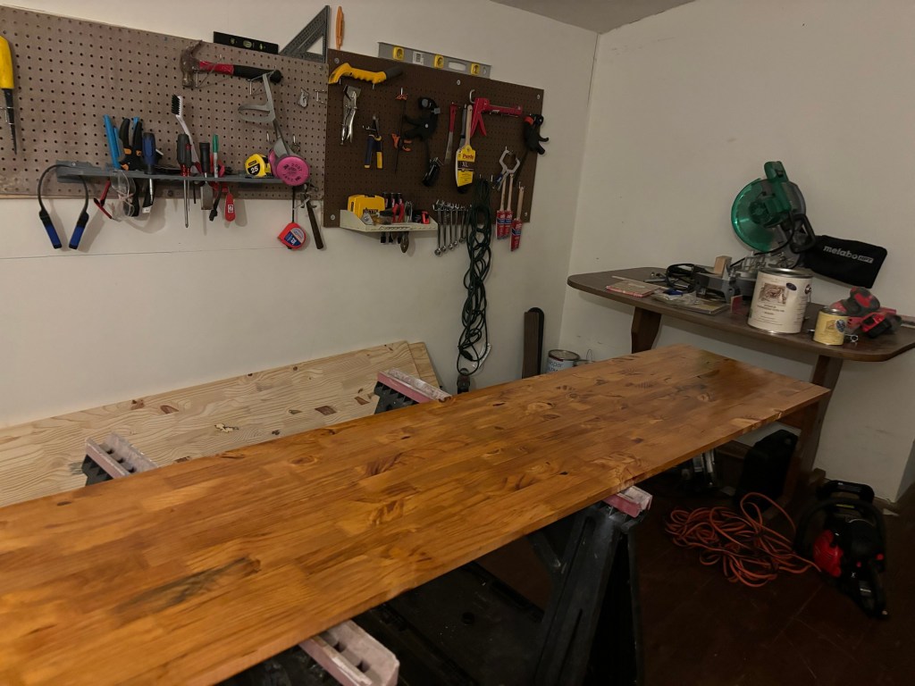 The weather has finally warmed to the point I can stain the wood panels which will make up the tabletop for my custom work table. The shop is an unheated space. Actually it has a gas wall heater but I refuse to leave that running – too much of a fire hazard. For the sealer and stain to set properly the temperature had to be at least 55. I know we’re in Alabama, but it still gets cold, so I’ve been patiently waiting.